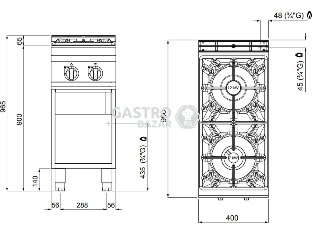 Plynový sporák - se 2 hořáky (19 kW)