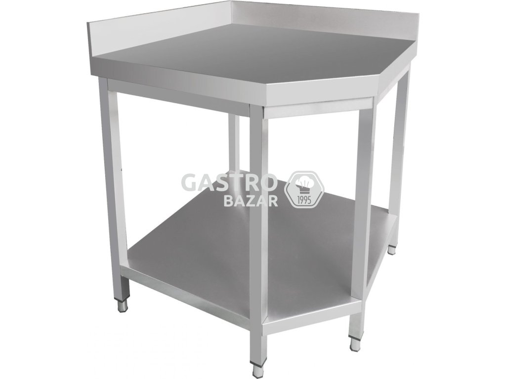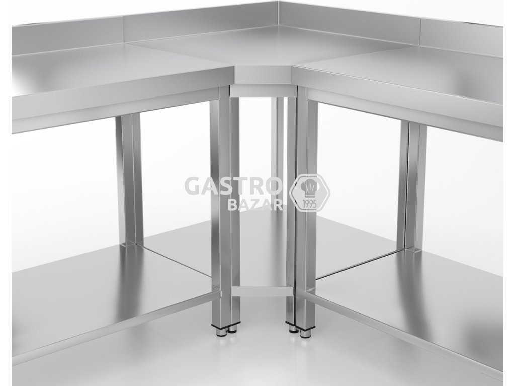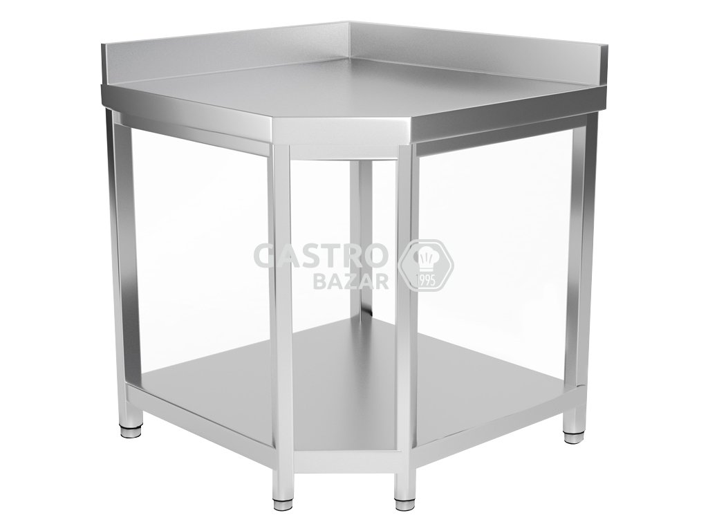 Rohový pracovní stůl 600 mm - z nerezové oceli se spodní policí a zadním lemem