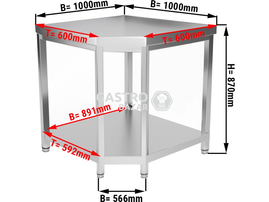 Rohový pracovní stůl je ideálním řešením pro efektivní využití rohového prostoru v profesionálních kuchyních. Je navržen tak, aby spojil dvě pracovní linie a zároveň poskytl stabilní a hygienickou pracovní plochu. Díky spodní polici umožňuje praktické odkládání náčiní a vybavení.