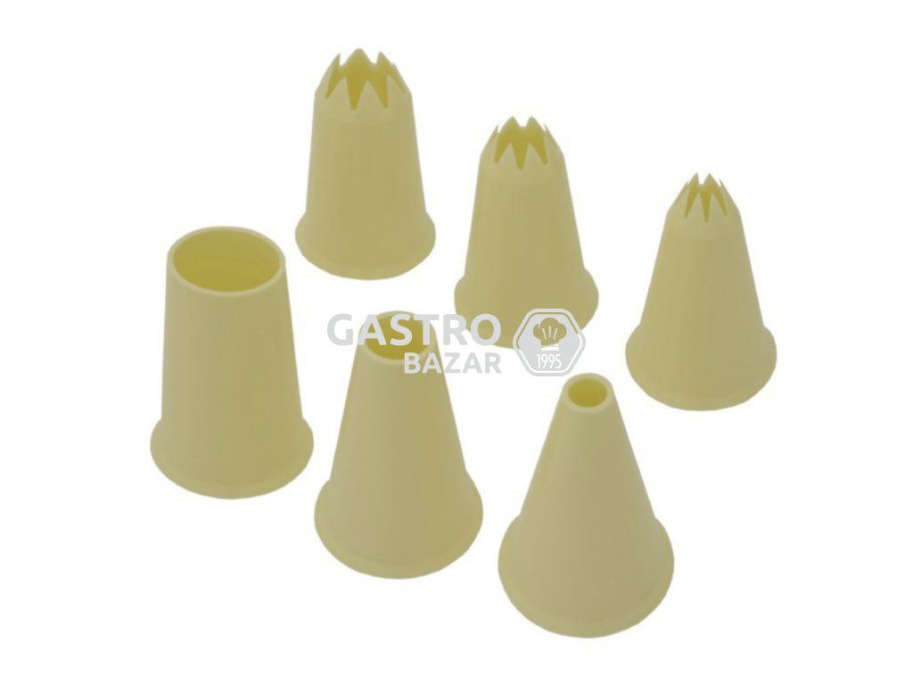 Sada plastových koncovek se skládá ze tří kusů ve tvaru hvězdy a tří kulatých kulatých kusů. Praktický set využijete při plnění forem, zdobení dortů nebo vytváření krémového povrchu, odpalového těsta nebo sněhových pusinek. Vnitřní povrch je hladký, proto se snadno čistí. Po dokončení práce ho pak jednoduše umyjete v myčce.