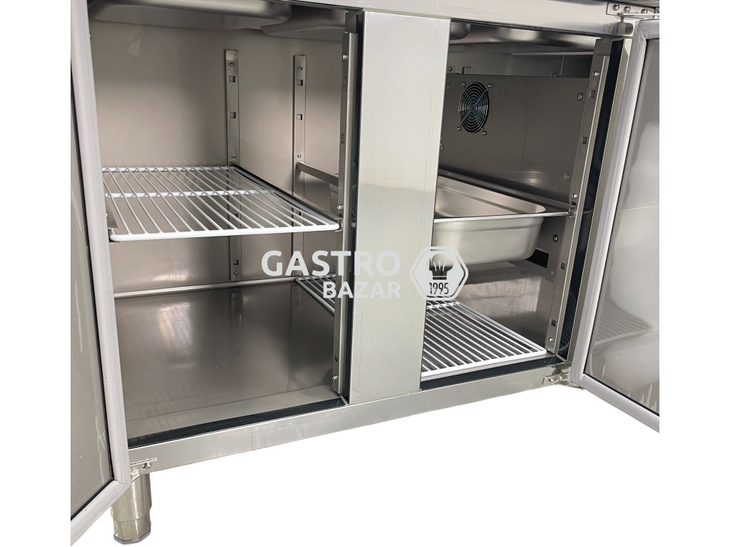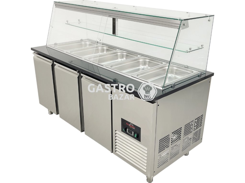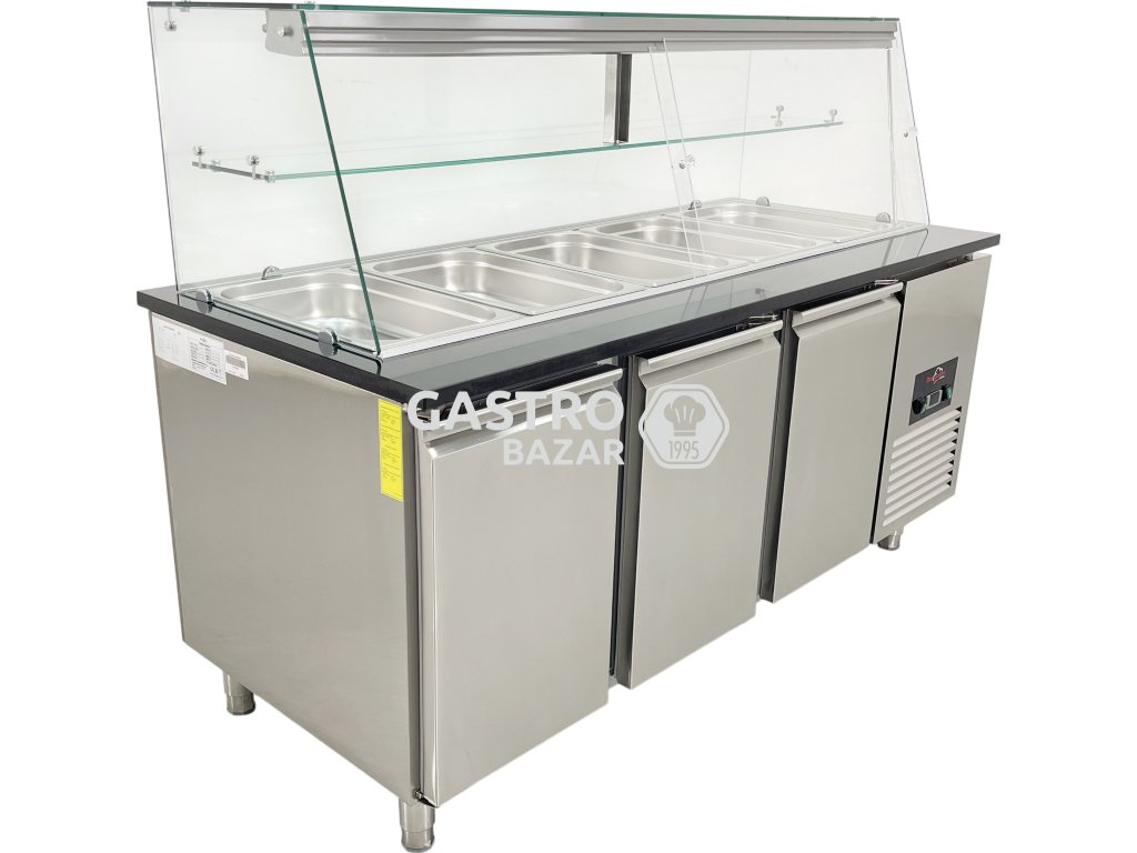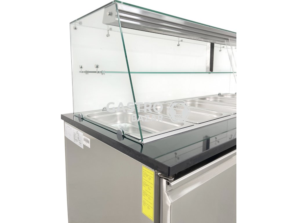 Chladiaci bufetový stôl určený na prezentáciu a výdaj hotových jedál v gastro prevádzkach, kantínach alebo hotelových bufetoch. Horná časť je vybavená na umiestnenie 5 nádob GN 1/1 , kde sú pokrmy prehľadne vystavené pod sklenenou nadstavbou s integrovaným osvetlením. Spodná časť ponúka chladiaci úložný priestor s možnosťou priameho vkladania GN nádob.