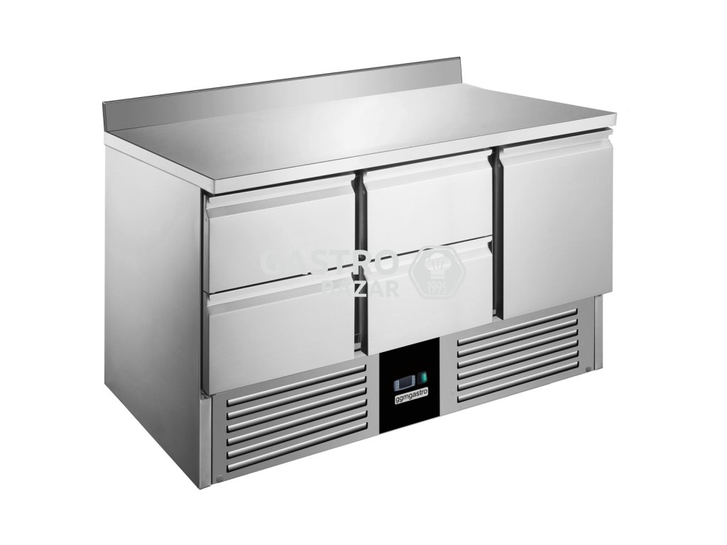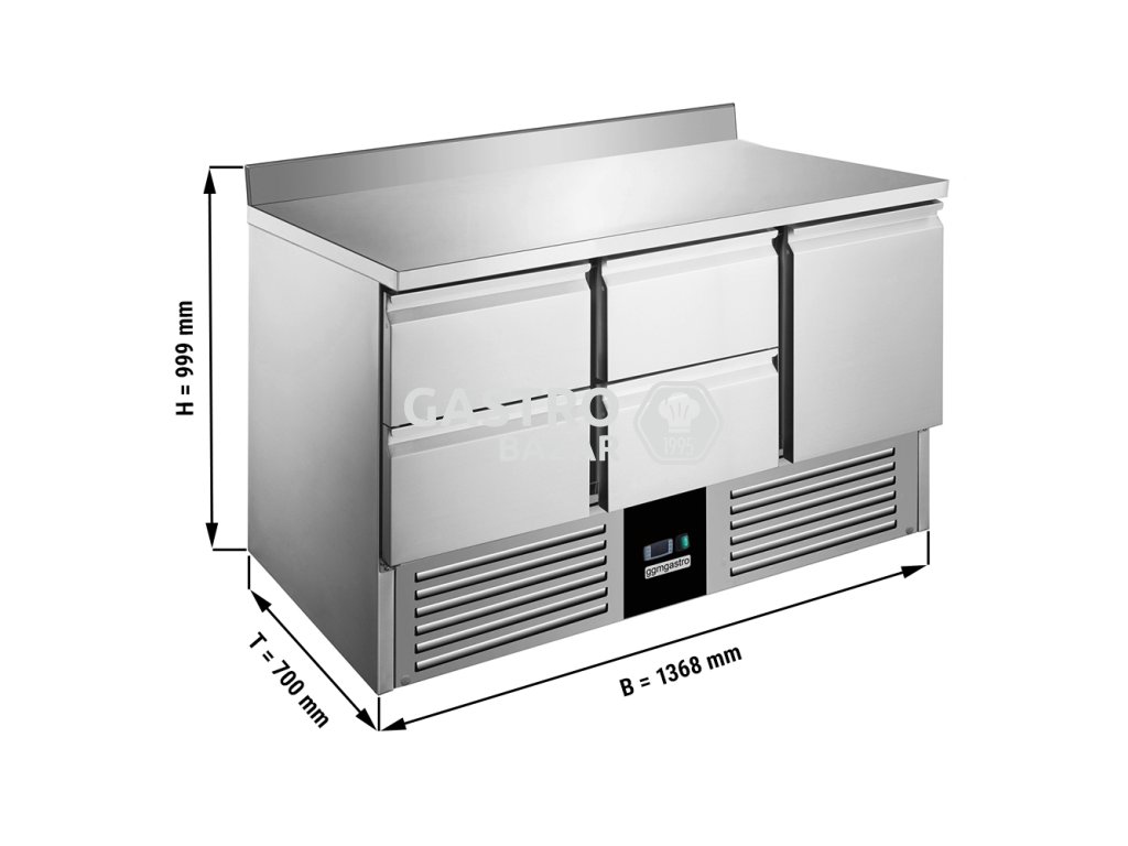 Chladiaci stôl na saladeta / pizzu PREMIUM - 1,37 x 0,7 m - s 1 dverami, 4 zásuvkami a podstavcom