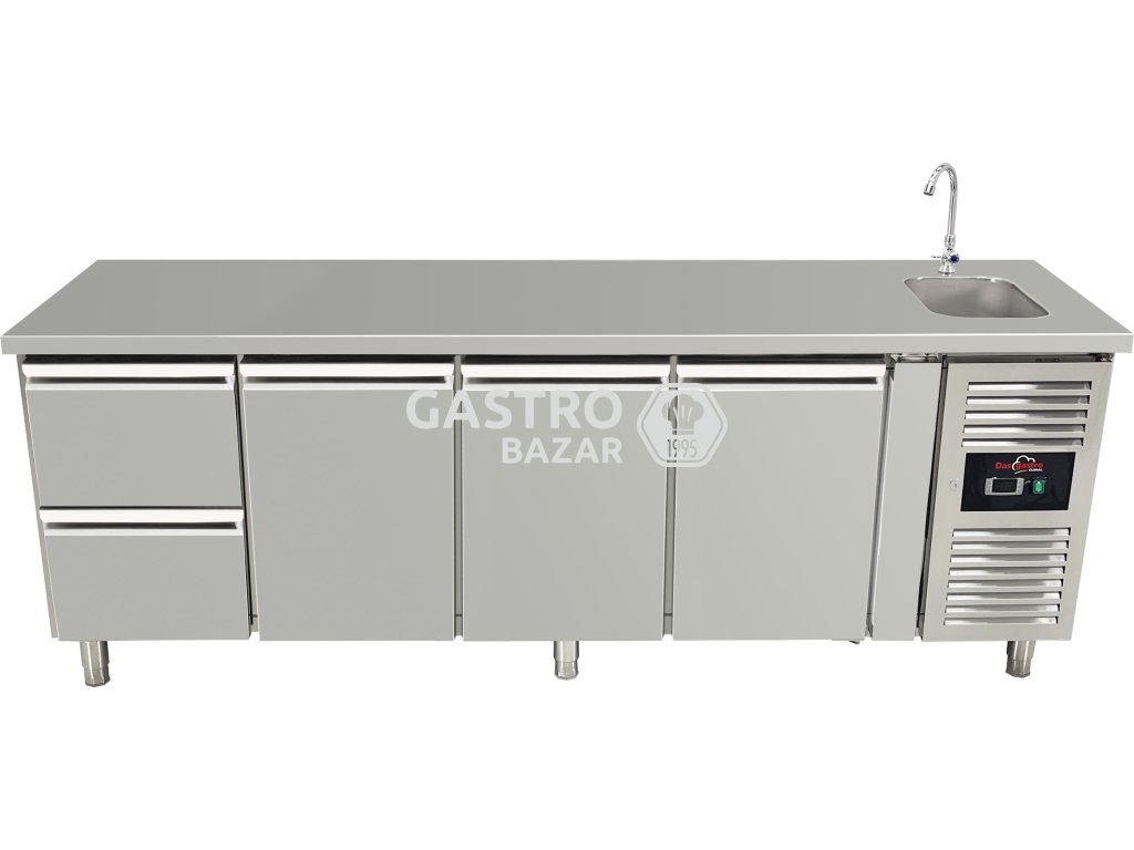 Model DAS4100TNSTRE je kombináciou výkonného chladiaceho zariadenia a praktického drezu. Vhodný pre prevádzky, ktoré potrebujú dostatok miesta na uskladnenie chladených potravín a zároveň umývaciu zónu integrovanú do jedného funkčného celku.