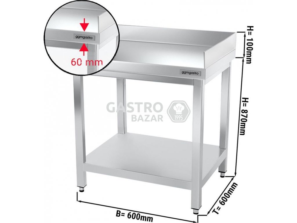 - Nerezový pracovný stôl PREMIUM so spodnou policou a lemom vzadu a vpravo - 600 x 600 x 870 mm
