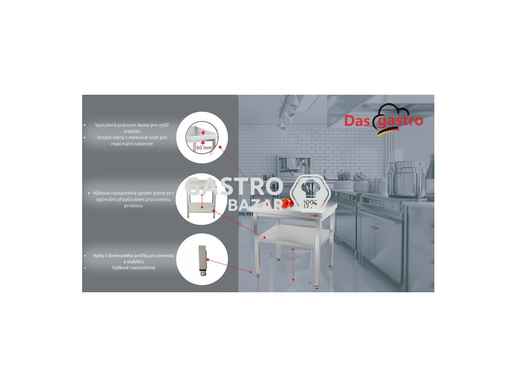 Nerezový pracovný stôl pre profesionálne prevádzky. Stabilná konštrukcia, ľahká údržba a praktická spodná polica z neho robia ideálnu voľbu do gastro kuchýň, prípravní i zázemia.