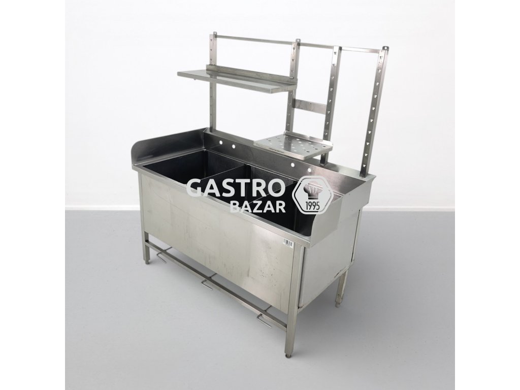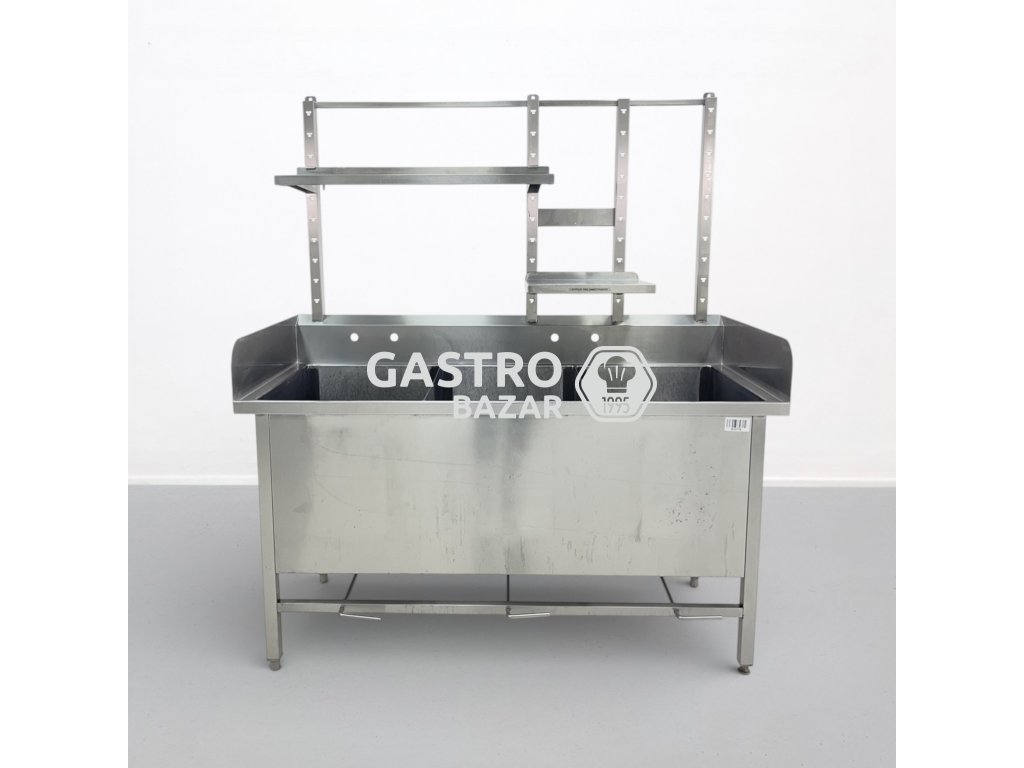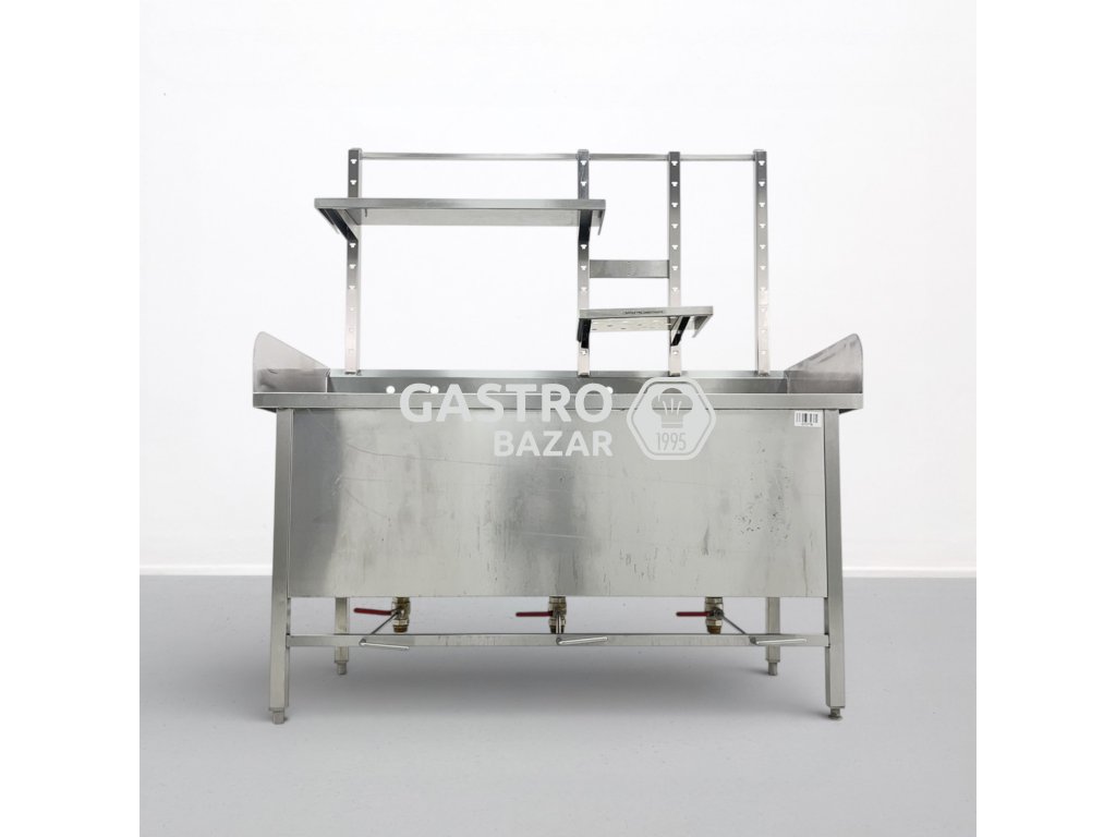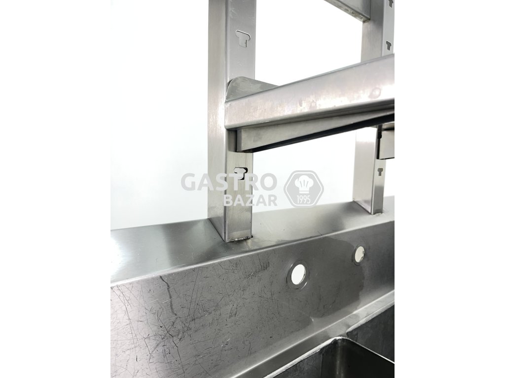 Masivní nerezový trojdřez určený pro profesionální gastronomické provozy. Robustní provedení s vysokým zadním lemem pomáhá chránit okolí proti rozstřiku vody. Součástí je také horní nástavec s odkládací perforovanou poličkou.