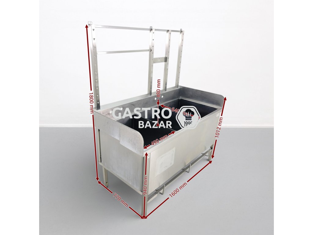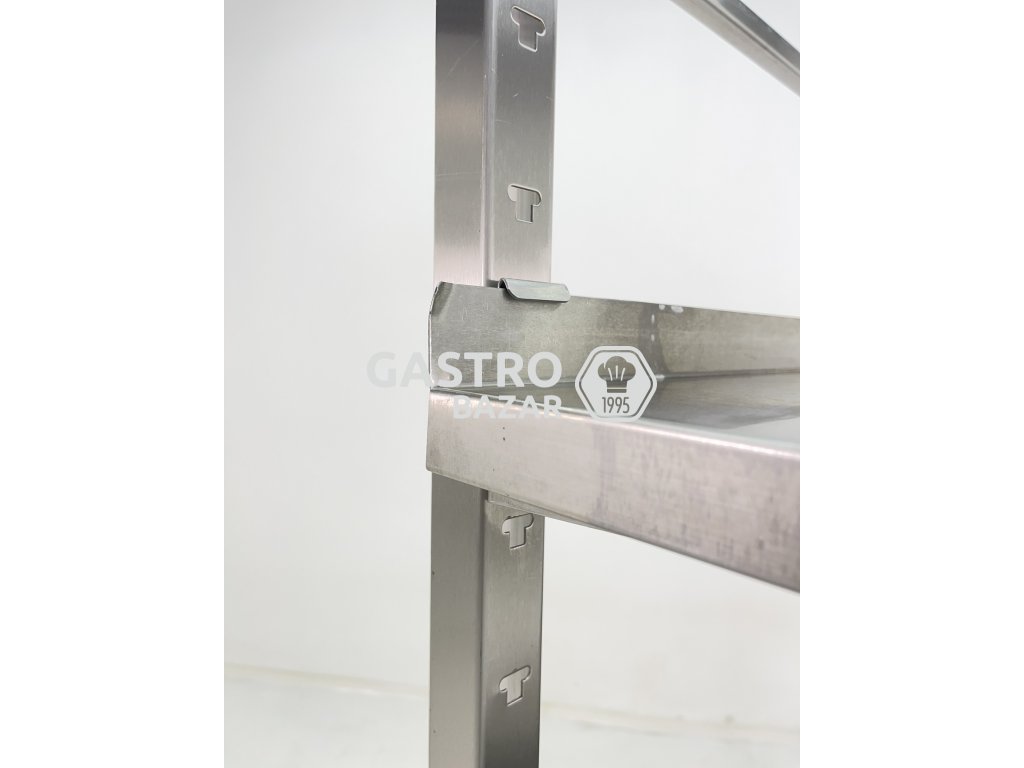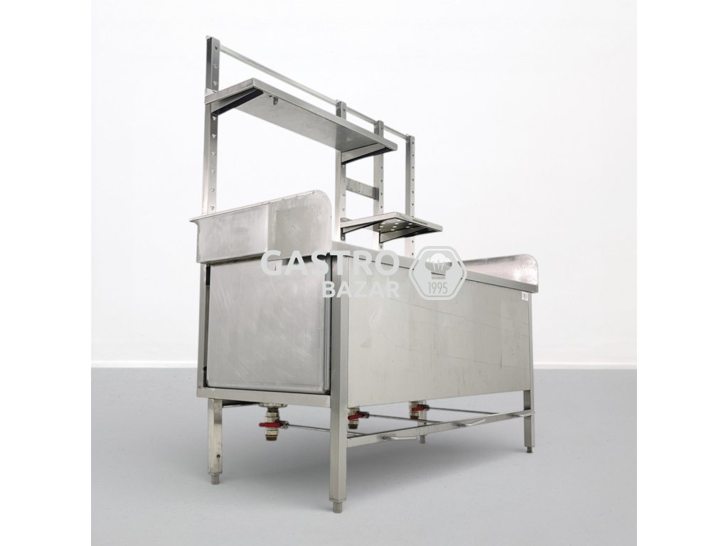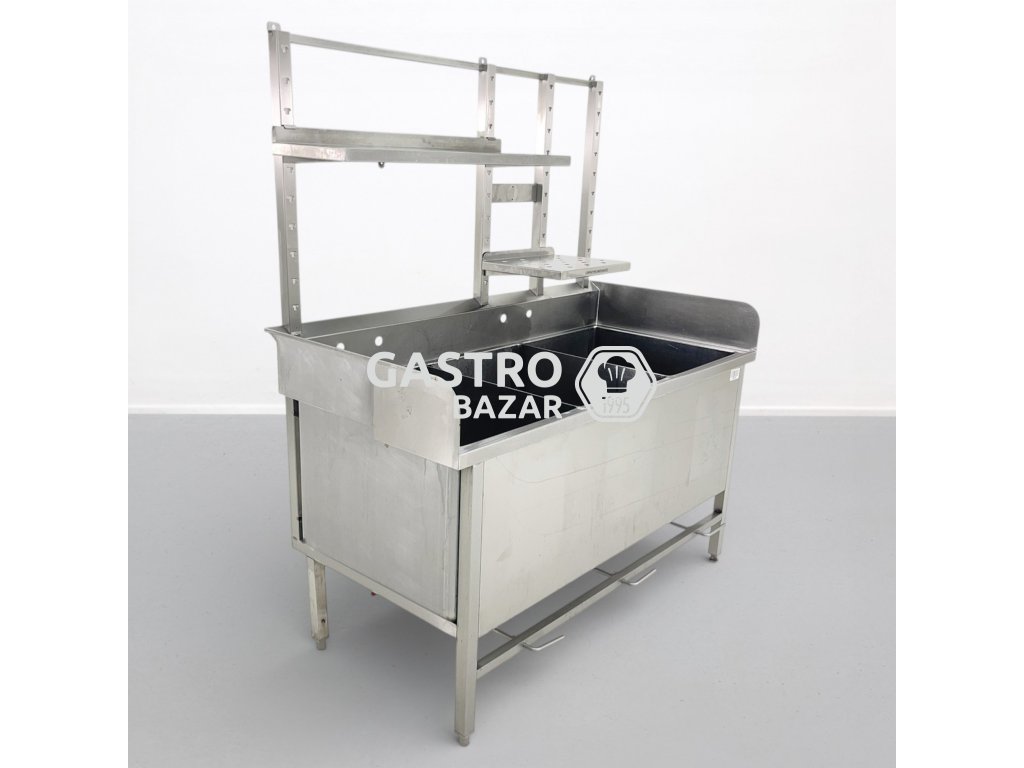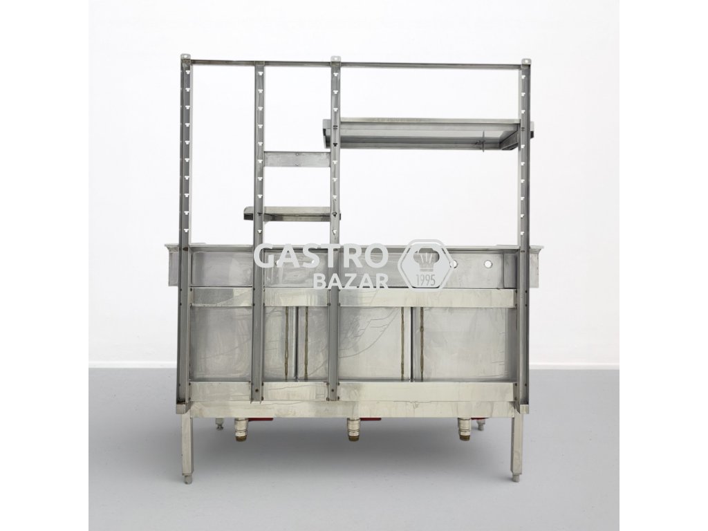 Masivní nerezový trojdřez určený pro profesionální gastronomické provozy. Robustní provedení s vysokým zadním lemem pomáhá chránit okolí proti rozstřiku vody. Součástí je také horní nástavec s odkládací perforovanou poličkou.