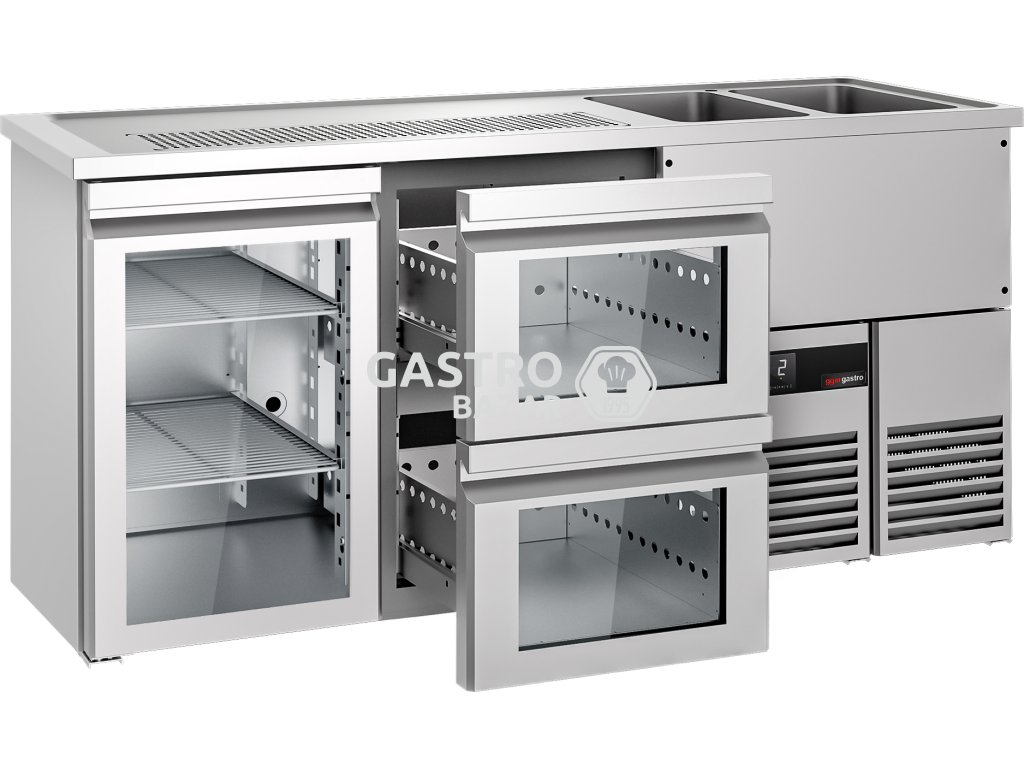 Pivný pult 1,95 x 0,7 m - 1 presklené dvierka s 2 sklenenými zásuvkami 1/2