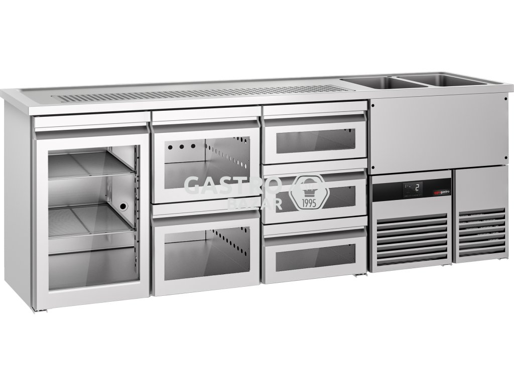 Pivný pult 2,5 x 0,7 m - 1 sklenené dvere s 2 sklenenými zásuvkami 1/2 a 3 sklenené zásuvky 1/3