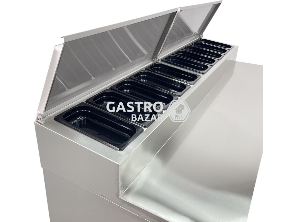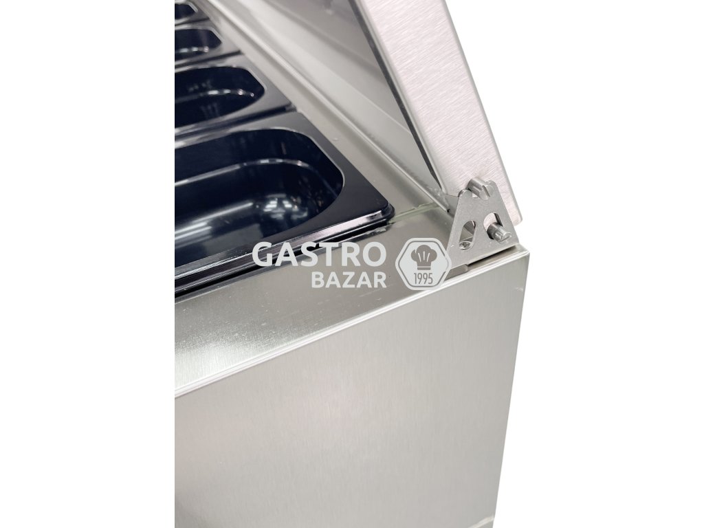 • Horná plocha je pripravená na osadenie GN nádob – zmestí sa 10 ks GN 1/3 v dvoch uzatvárateľných sekciách po piatich (maximálna hĺbka 15 cm)