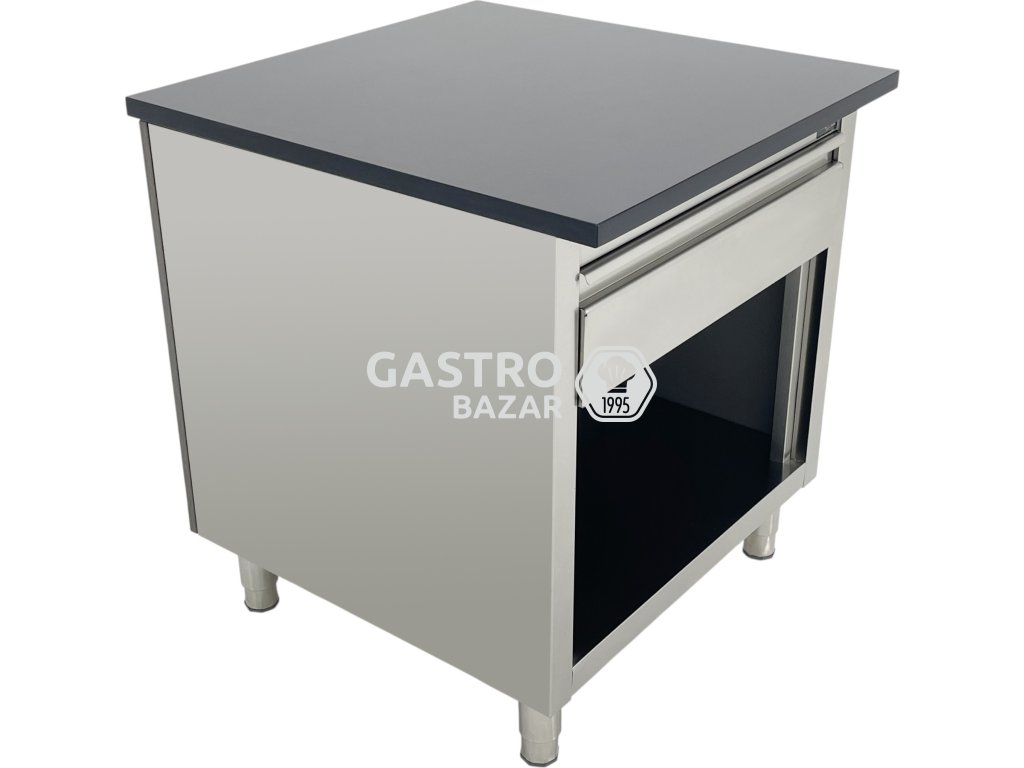 Pult je vyrobený z laminovanej MDF dosky v modernom šedom drevodekore , doplnené o hornú pracovnú dosku v atraktívnom čiernom mramorovom dekore . Konštrukcia je pevná a navrhnutá pre každodennú záťaž v gastro aj retail prostredí. Horná plocha pohodlne pojme pokladňu, platobný terminál aj tlačiareň. Spodná časť je vybavená odkladacími a úložnými priestormi pre potreby obsluhy. Povrchy sú odolné voči poškriabaniu a ľahké na údržbu.