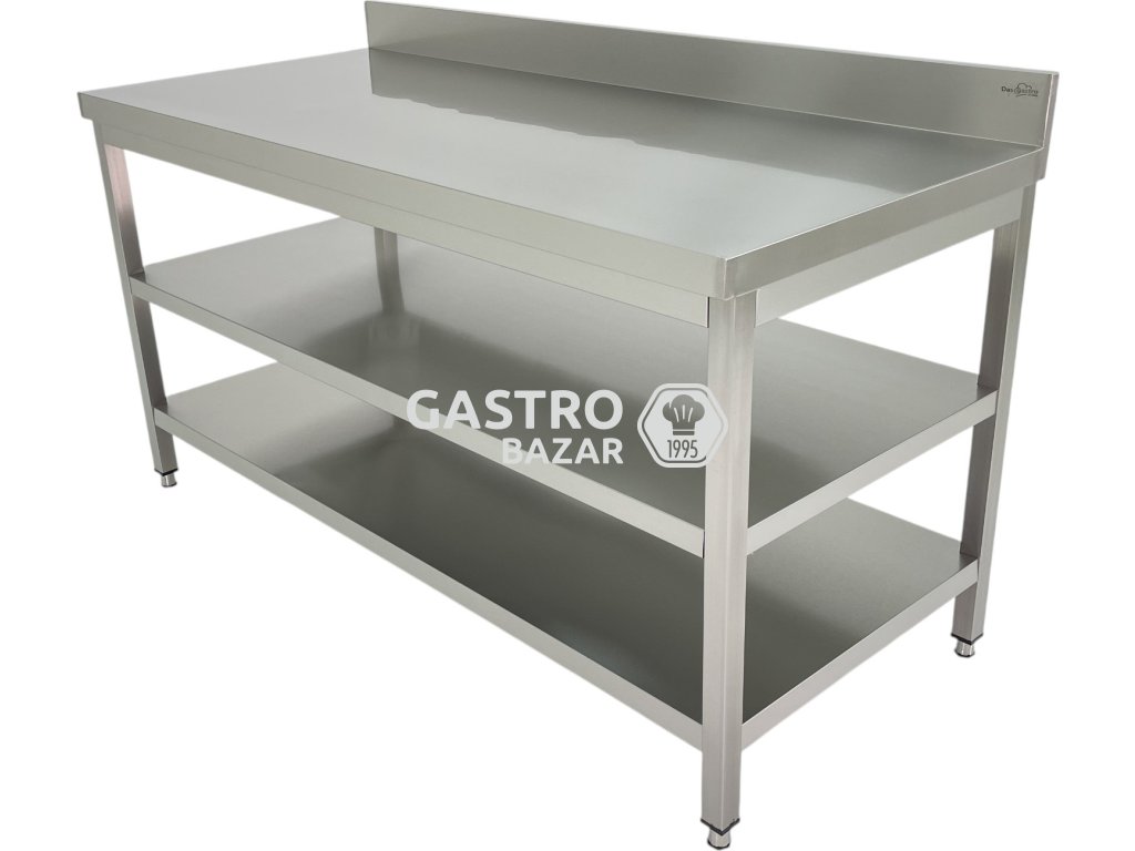 Nerezový pracovný stôl PREMIUM s dvoma policami a zadným lemom 2,0 m