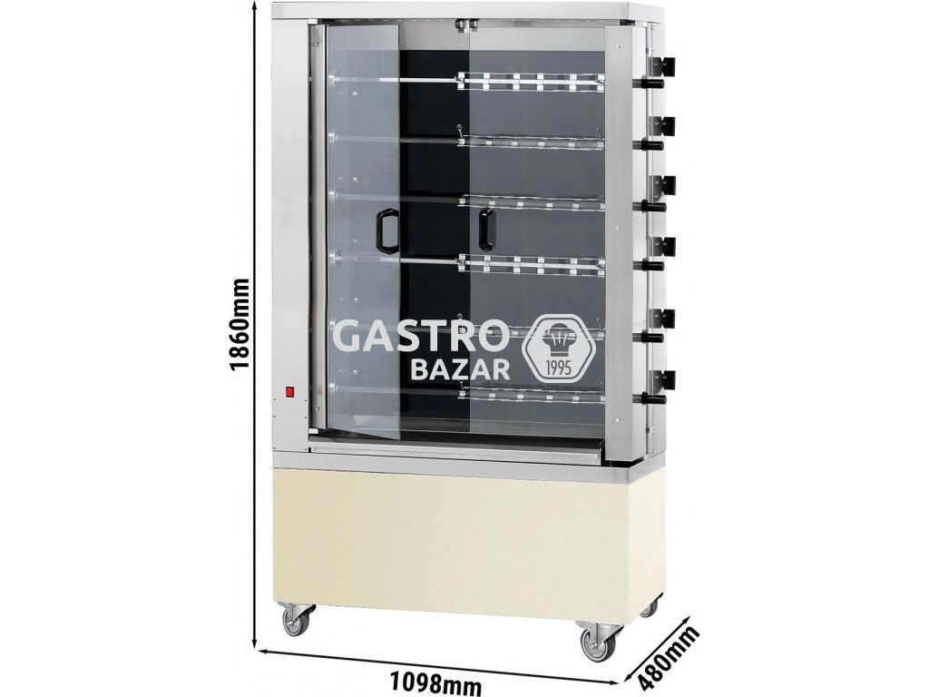 Sklokeramický elektrický gril na kuřata PREMIUM se 6 rožni pro 36 kuřat - 1098 x 480 x 1860 mm