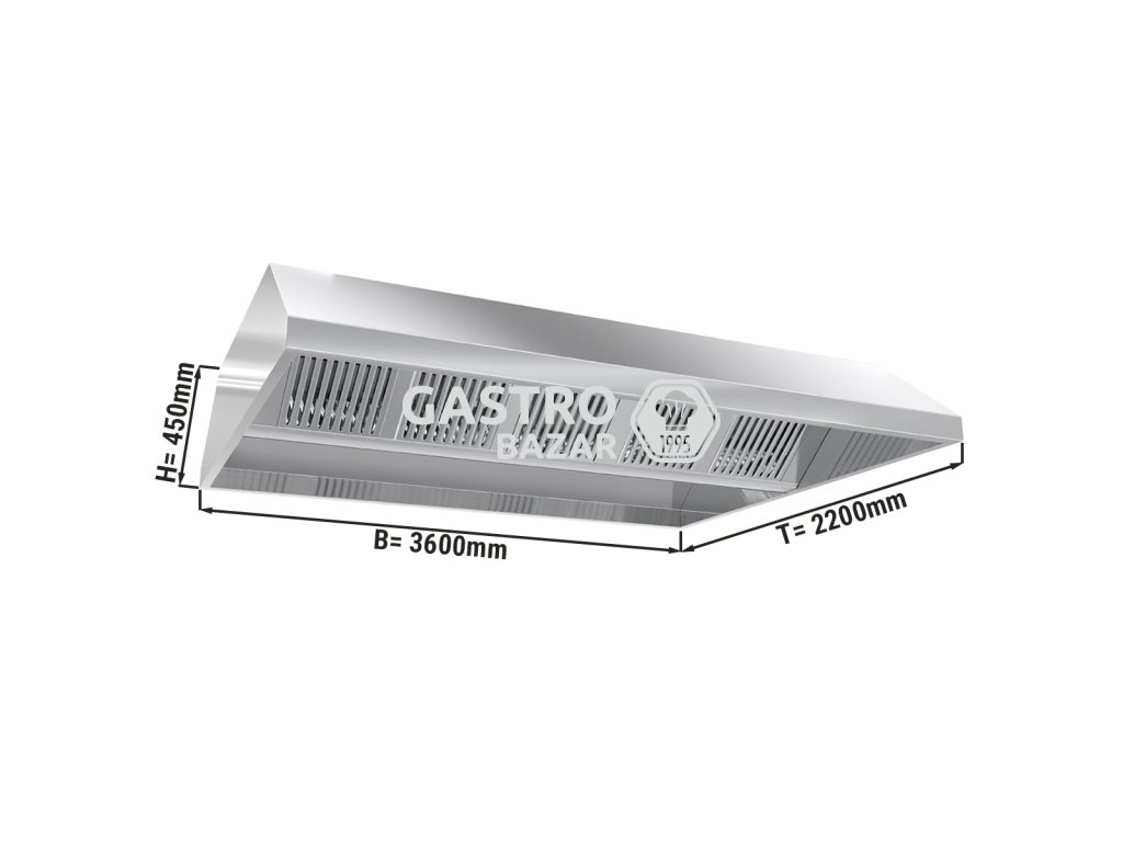 Stropní digestoř 3,6 m - s filtrem a lampou- hloubka: 2200 mm