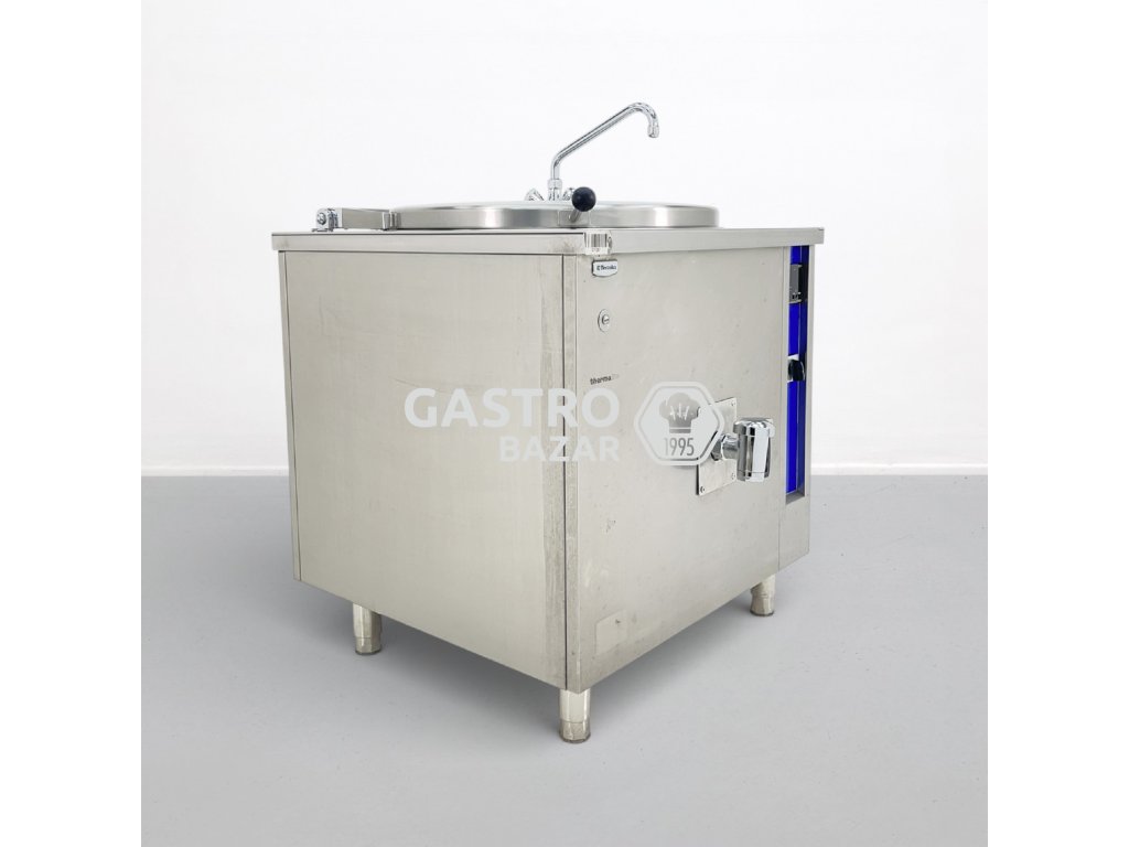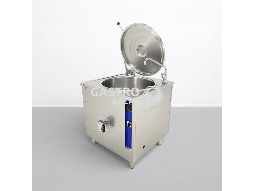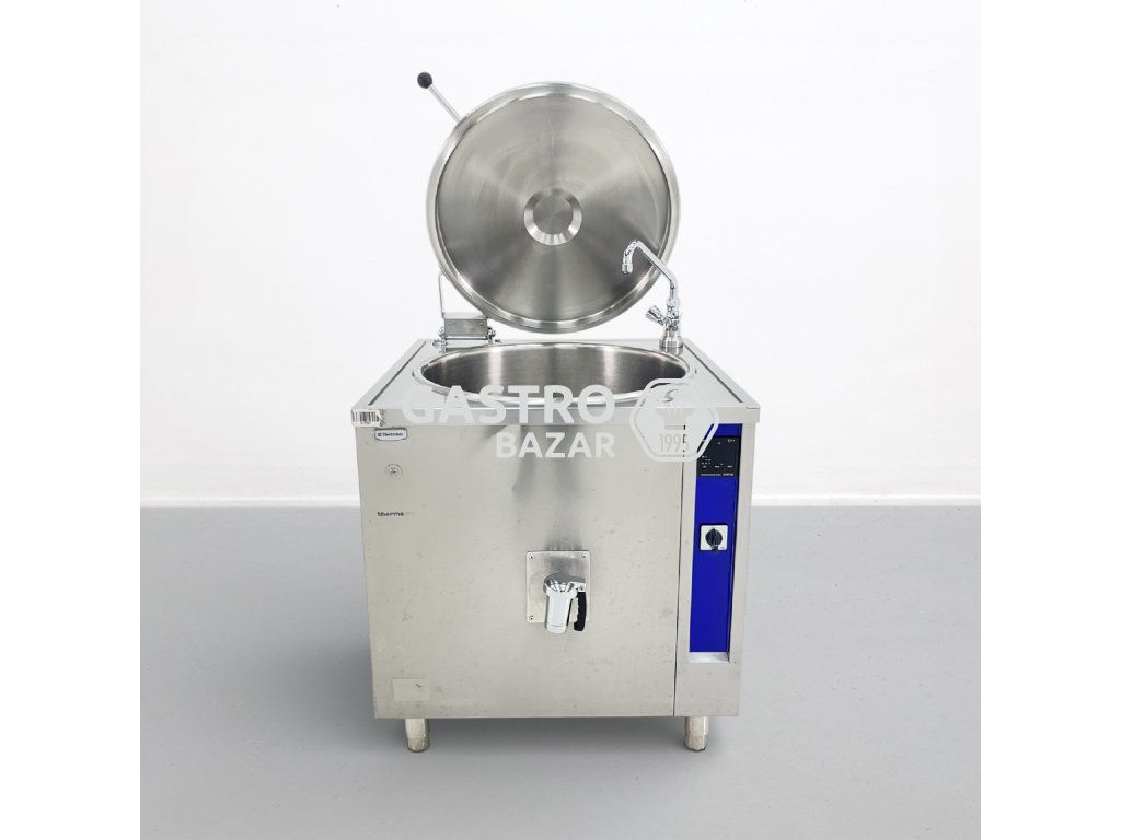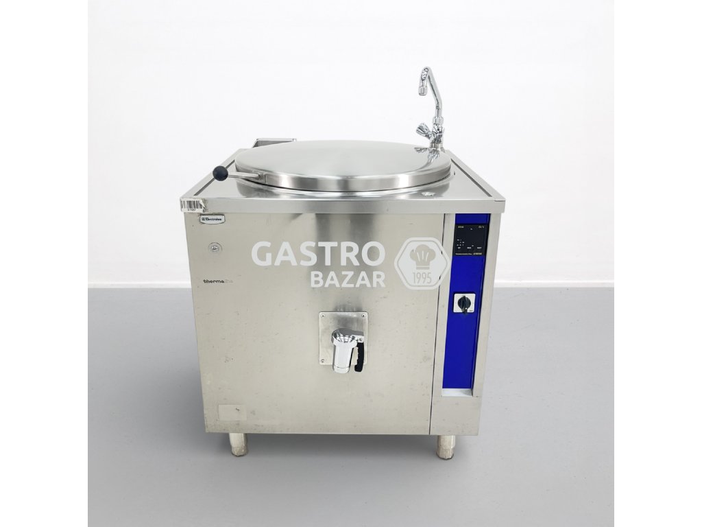 Profesionální varný kotel Electrolux Thermaline o objemu 150 l, vhodný pro gastronomické provozy. Zařízení bylo upraveno z původního ovládání na manuální řízení výkonu pomocí přepínání topných spirál.